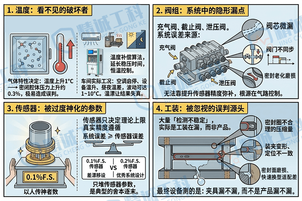 气体特性决定:温度上升 1℃ → 密闭腔体压力上升约 0.3%,极易造成误判。